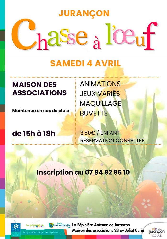 La Pépinière antenne de Jurançon organise une chasse à l’œuf le samedi 4 avril de 15h à 18h à la maison des associations de Jurançon.