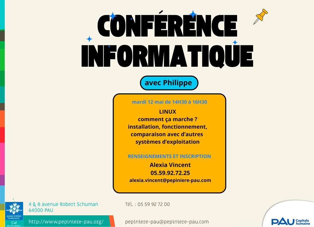 Philippe vous donne rendez-vous le mardi 12 mai de 14h30 à 16h30 pour tout vous expliquer sur Linux : son installation, son fonctionnement, et les différences et similitudes avec les systèmes d’exploitation Windows ou MacOS.